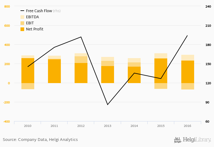 The company generated cash, defined by a sum of net profit and depreciation, of CZK 295 mil or 26.8% of sales. When investments are excluded, free cash flow reached CZK 194 mil, or 17.7% of sales in 2016.