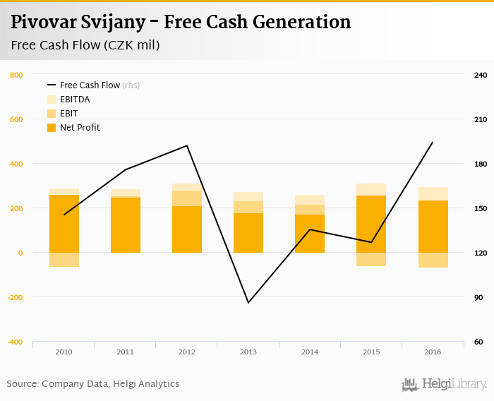 Pivovar Svijany made a net profit of CZK 236 mil with revenues of CZK 1,100 mil in 2016, down by 8.46% and down by 0.096%, respectively, compared to the previous year. This translates into a net margin of 21.5%.