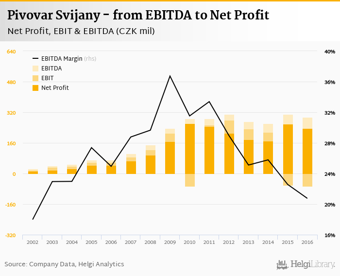 As far as Pivovar Svijany's peers are concerned, Heineken Czech Republic posted net and EBITDA margin of 5.26% and 17.0%, respectively in 2016, Budejovicky Budvar generated margins of 10.1% and 22.3% and Plzensky Prazdroj profit margin reached 26.0% on the net and 44.5% on the EBITDA level in 2019.