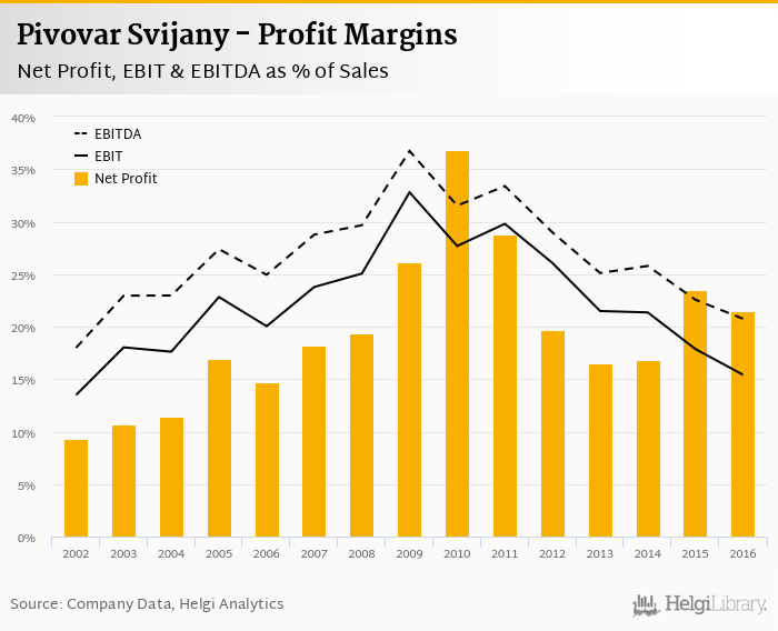 Pivovar Svijany made a net profit of CZK 236 mil with revenues of CZK 1,100 mil in 2016, down by 8.46% and down by 0.096%, respectively, compared to the previous year.