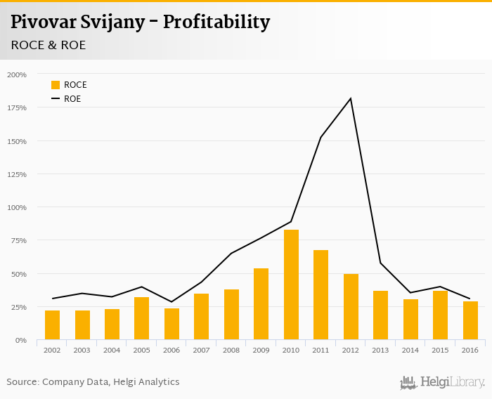 As far as Pivovar Svijany's peers are concerned, Heineken Czech Republic generated ROE of 20.0% and ROCE of 7.73% in 2016. Budejovicky Budvar's profitability reached 6.05% and 10.6%, respectively. Plzensky Prazdroj operated with 71.3% and 31.4% returns in 2016.