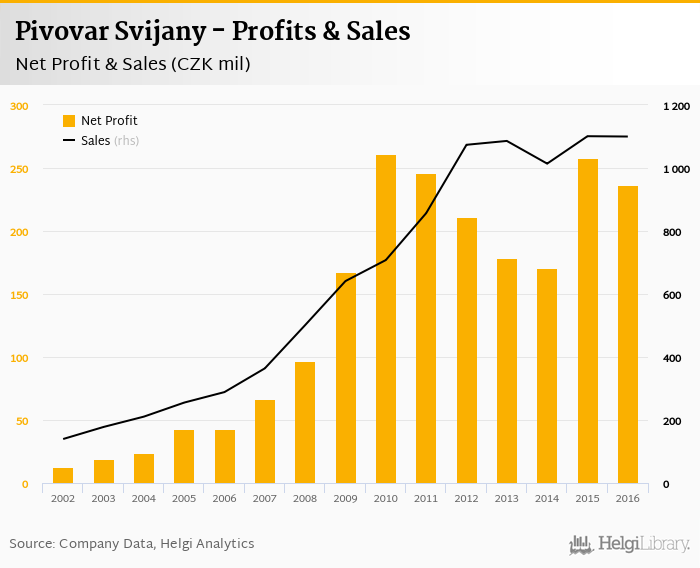 Pivovar Svijany made a net profit of CZK 236 mil in 2016, down 8.46% compared to the previous year. Total sales reached CZK 1,100 mil, which is down 0.096% when compared to the previous year.