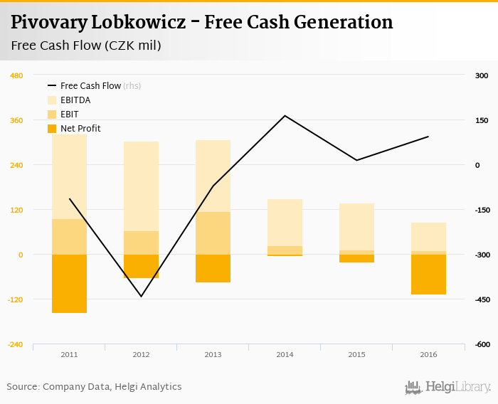 The company generated cash, defined by a sum of net profit and depreciation, of CZK -30.7 mil or -2.61% of sales. When investments are excluded, free cash flow reached CZK 93.1 mil, or 7.92% of sales in 2016.