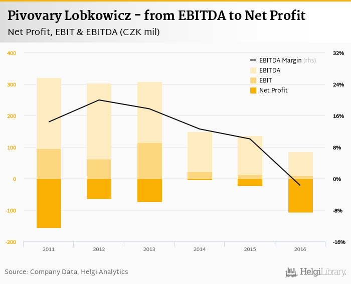 Pivovary Lobkowicz made a net profit of CZK -106 mil with revenues of CZK 1,176 mil in 2016, down by 395% and up by 2.41%, respectively, compared to the previous year. This translates into a net margin of -9.05%.