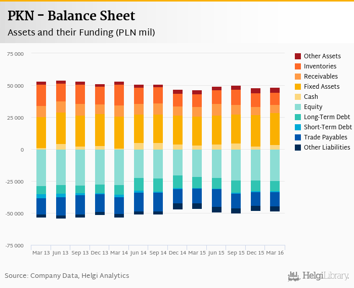 PKN's total assets reached PLN 48,217 mil at the end of 1Q2016, up 3.61% compared to the previous year.