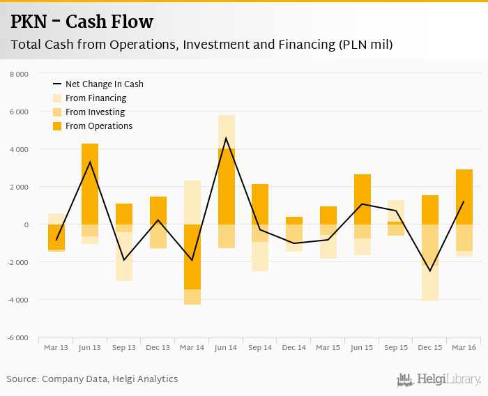 PKN's operating cash flow stood at PLN 2,927 mil in 1Q2016, up 199% when compared to the previous year. Historically, between 1Q2013 - 1Q2016, the firm’s operating cash flow reached a high of PLN 4,289 mil in 2Q2013 and a low of PLN -3,440 mil in 1Q2014.