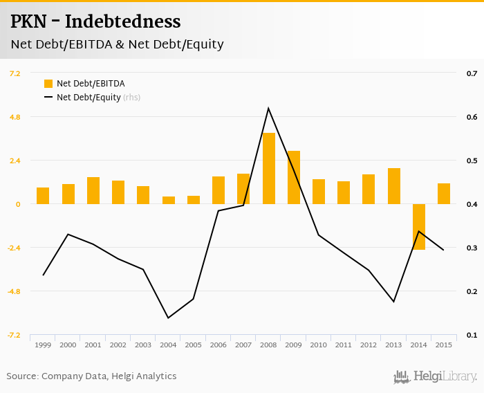 PKN's net debt stood at PLN 7,092 mil and accounted for 0.293 of equity at the end of 2015. The ratio is down 0.043 pp compared to the previous year.