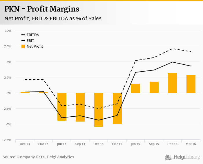 PKN made a net profit of PLN 337 mil with revenues of PLN 16,213 mil in 1Q2016, down by 55.4% and down by 19%, respectively, compared to the previous year.