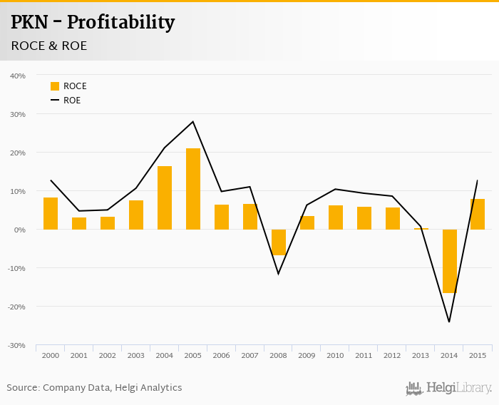 PKN made a net profit of PLN 2,837 mil in 2015, up 149% compared to the previous year. Historically, between 1999 and 2015, the company's net profit reached a high of PLN 4,585 mil in 2005 and a low of PLN -5,811 mil in 2014.