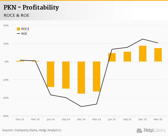 PKN made a net profit of PLN 337 mil in 1Q2016, down 55.4% compared to the previous year. Historically, between 1Q2013 and 1Q2016, the company's net profit reached a high of PLN 1,367 mil in 2Q2015 and a low of PLN -5,197 mil in 2Q2014.
