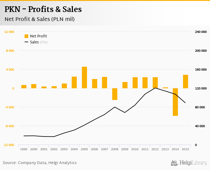 PKN made a net profit of PLN 2,837 mil in 2015, up 149% compared to the previous year. Total sales reached PLN 88,336 mil, which is down 17.3% when compared to the previous year.