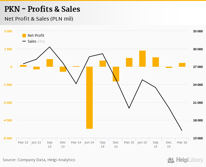 PKN made a net profit of PLN 337 mil in 1Q2016, down 55.4% compared to the previous year. Total sales reached PLN 16,213 mil, which is down 19% when compared to the previous year.