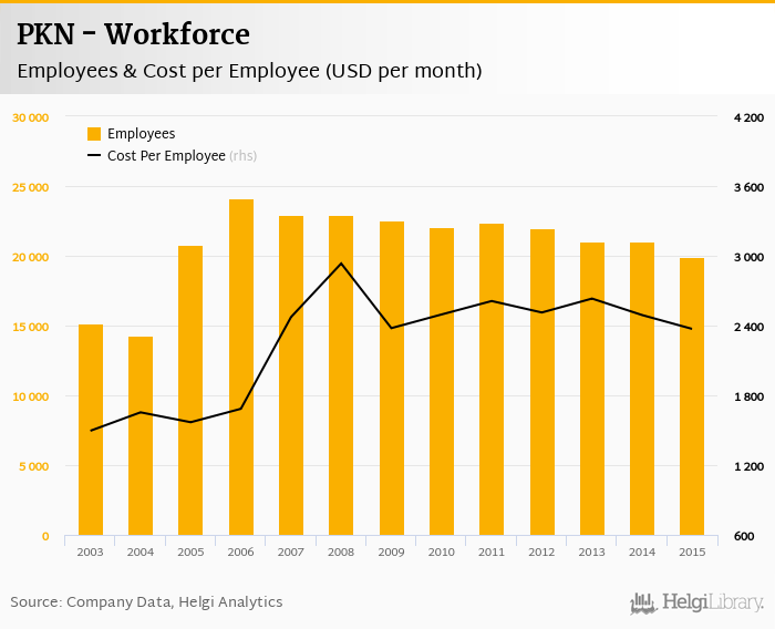 PKN employed 19,932 employees in 2015, down 5.2% compared to the previous year. Historically, between 2000 and 2015, the firm's workforce hit a high of 24,113 employees in 2006 and a low of 13,342 employees in 2000.