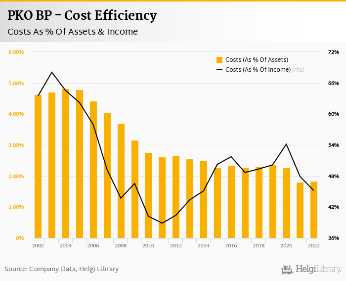 PKO BP's cost to income ratio reached 45.1% in 2022, down from 47.9% compared to the previous year.