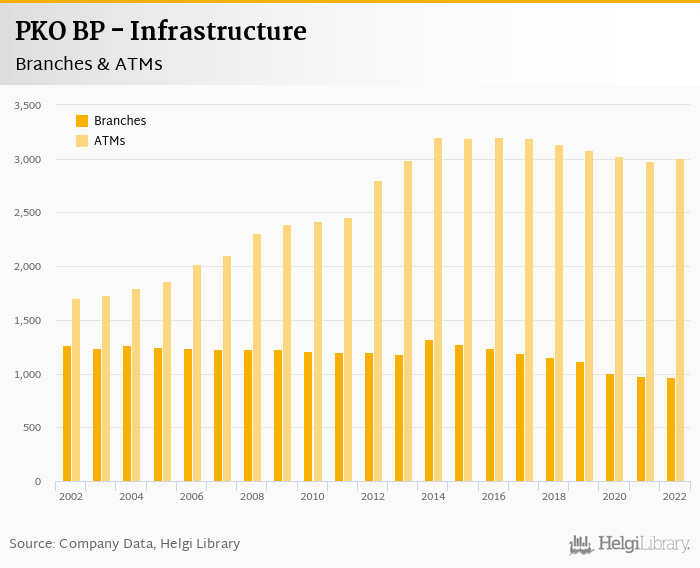 Comparing PKO BP with its closest peers, Santander Bank Polska operated a network of 385 branches and 1,424 ATMs in 2022 and Pekao had 597 branches and 1,328 ATMs.
