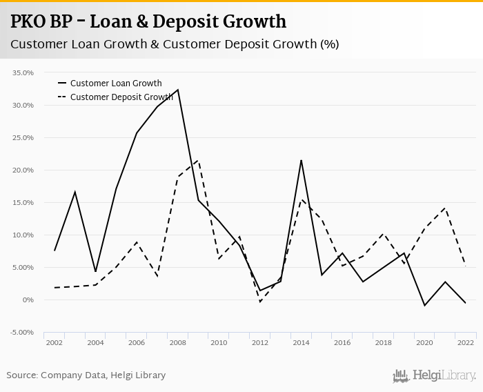PKO BP's customer loan growth reached -0.572% in 2022, down from 2.71% compared to the previous year. Historically, the bank’s loans growth reached an all time high of 32.3% in 2008 and an all time low of -0.910% in 2020. In the last decade, the average annual loan growth amounted to 4.97%.
