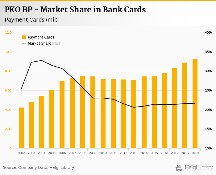 PKO BP therefore accounted for 21.6% of all bank cards issued by banks in Poland at the end of 2019. Historically, the bank’s market share in payment cards reached an all time high of 32.7% in 2004 and an all time low of 20.6% in 2013.