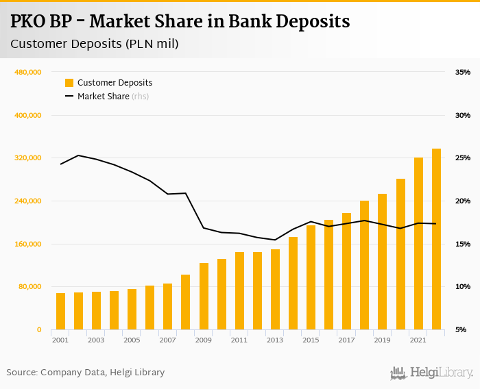 PKO BP accounted for 17.3% of all customer deposits taken by banks in Poland at the end of 2022. Historically, the bank’s market share in customer deposits reached an all time high of 25.3% in 2002 and an all time low of 15.4% in 2013.