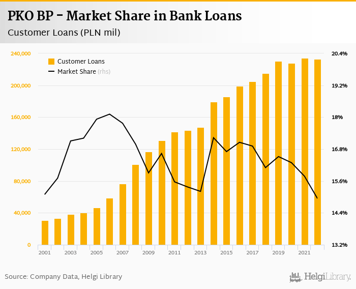 PKO BP accounted for 14.9% of all customer loans issued in Poland at the end of 2022. Historically, the bank’s market share in customer loans reached an all time high of 18.1% in 2006 and an all time low of 14.9% in 2022.