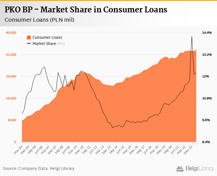 PKO BP accounted for 12.2% of all consumer loans issued in Poland at the end of 2023-06-30. Historically, the bank’s market share in consumer loans reached an all time high of 14.2% in 2022-12-31 and an all time low of 9.18% in 2014-03-31.