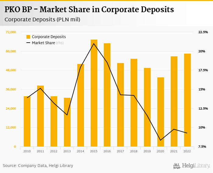 PKO BP accounted for 9.26% of all corporate deposits taken by banks in Poland at the end of 2022. Historically, the bank’s market share in corporate deposits reached an all time high of 21.0% in 2015 and an all time low of 8.32% in 2020.