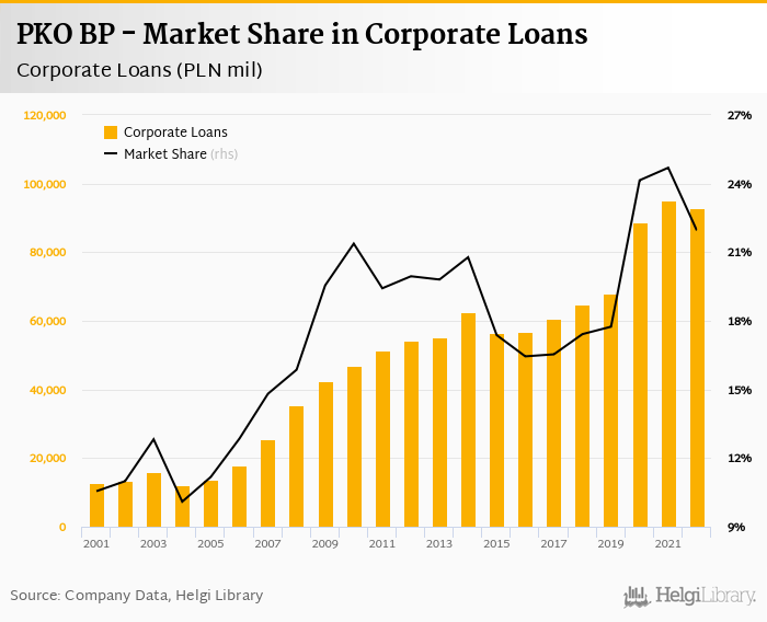 PKO BP accounted for 22.0% of all corporate loans issued in Poland at the end of 2022. Historically, the bank’s market share in corporate loans reached an all time high of 24.7% in 2021 and an all time low of 10.1% in 2004.