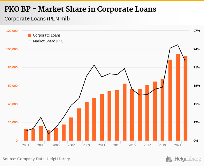 PKO BP accounted for 22.0% of all corporate loans issued in Poland at the end of 2022. Historically, the bank’s market share in corporate loans reached an all time high of 24.7% in 2021 and an all time low of 10.1% in 2004.