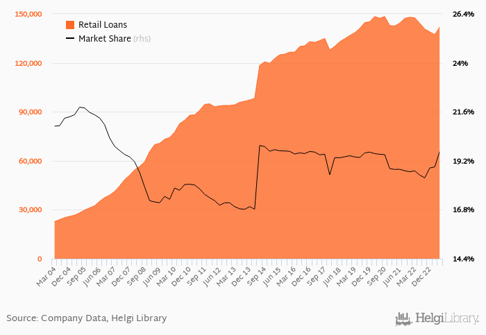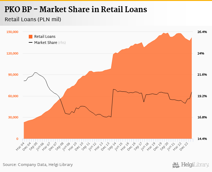 PKO BP accounted for 19.7% of all retail loans issued in Poland at the end of 2Q2023. Historically, the bank’s market share in retail loans reached an all time high of 21.8% in 2Q2005 and an all time low of 16.8% in 3Q2013.