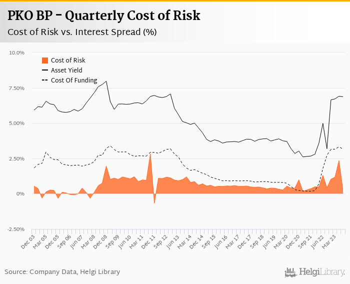 PKO BP's Cost of Risk (loan loss provisions as % of total assets) amounted to 0.233% in the third quarter of 2023, down from 2.34% when compared to the previous quarter.