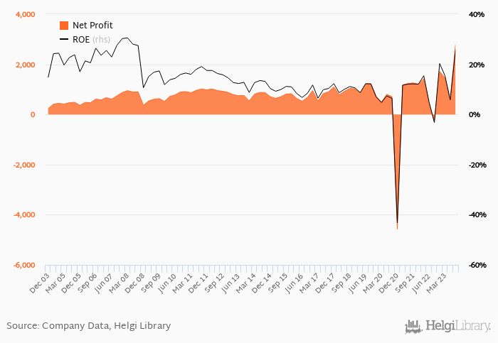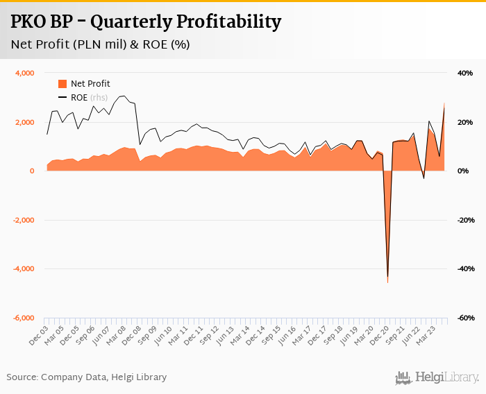 Historically, the bank’s net profit reached an all time high of PLN 2,780 mil in 3Q2023 and an all time low of PLN -4,576 mil in 4Q2020. The average profit in the last six quarters amounted to PLN 1,118 mil.