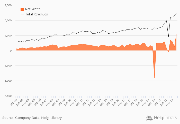 On the other hand, bank’s revenues amounted to an all time high of PLN 6,159 mil in 3Q2023 and an all time low of PLN 1,368 mil in 3Q2004. The average revenues in the last six quarters reached PLN 5,029 mil.