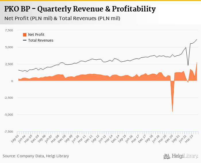Historically, the bank’s net profit reached an all time high of PLN 2,780 mil in 3Q2023 and an all time low of PLN -4,576 mil in 4Q2020. The average profit in the last six quarters amounted to PLN 1,118 mil.