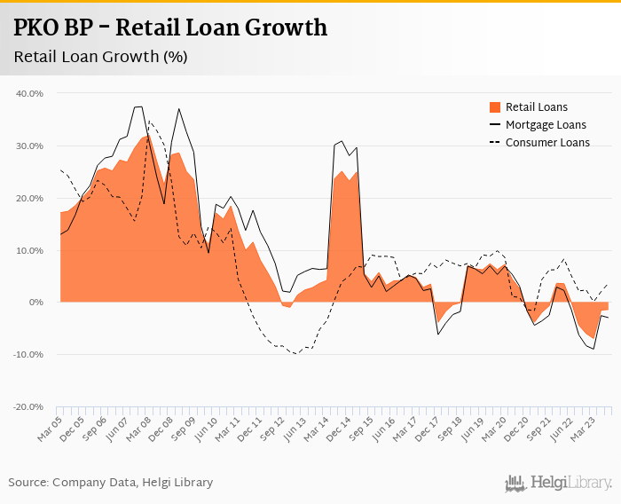 PKO BP's retail loans reached PLN 138,728 mil at the end of 2023-09-30, down 2.29% compared to the previous year. In the last decade, the average annual loan growth amounted to 3.70%.