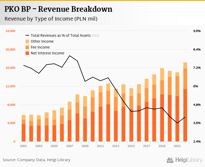 Historically, the bank’s revenues containing of interest, fee and other non-interest income reached an all time high of PLN 17,209 mil in 2022 and an all time low of PLN 5,773 mil in 2003. The average revenue in the last five years amounted to PLN 15,636 mil.