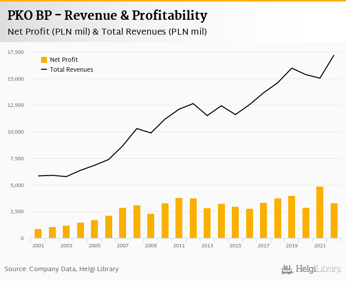 Comparing PKO BP with its closest peers, Santander Bank Polska generated a net profit of PLN 3,009 mil with revenues of PLN 12,183 mil in 2022, Pekao netted PLN 1,719 mil (revenues of PLN 10,761 mil) and ING Bank Slaski announced a net profit of PLN 1,944 mil (revenues of PLN 7,697 mil).