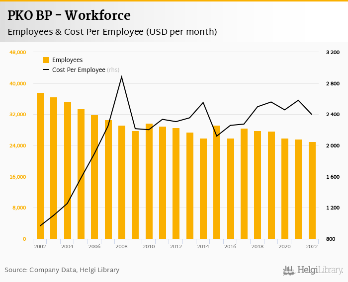 PKO BP employed 25,071 persons in 2022, down 2.28% when compared to the previous year. Historically, the bank's workforce hit an all time high of 37,667 persons in 2002 and an all time low of 25,071 in 2022.