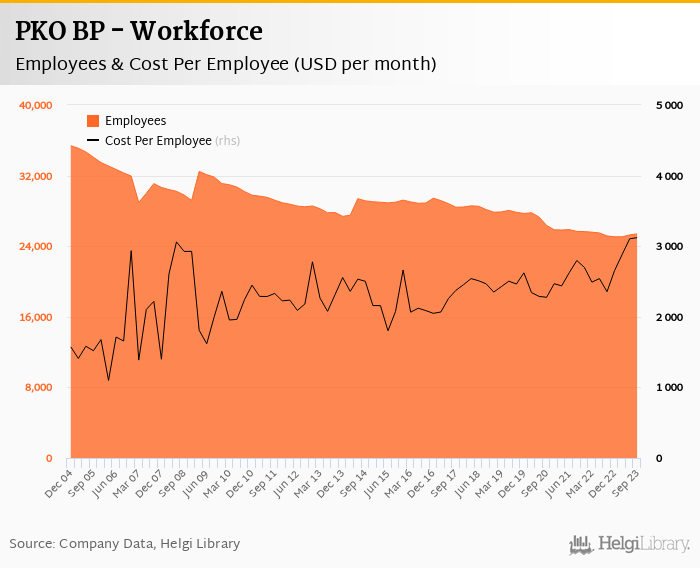 PKO BP employed 25,398 persons in 2023-09-30, up 0.463% when compared to the previous year. Historically, the bank's workforce hit an all time high of 35,386 persons in 2004-12-31 and an all time low of 25,065 in 2023-03-31.