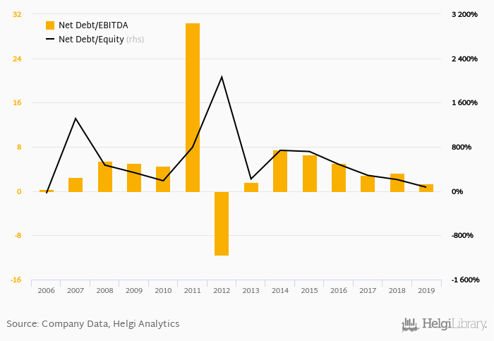 Historically, the firm’s net debt to equity reached a high of 2,061% in 2012 and a low of -40.0% in 2006 between 2006 and 2019. The average for the last five years was 352%.