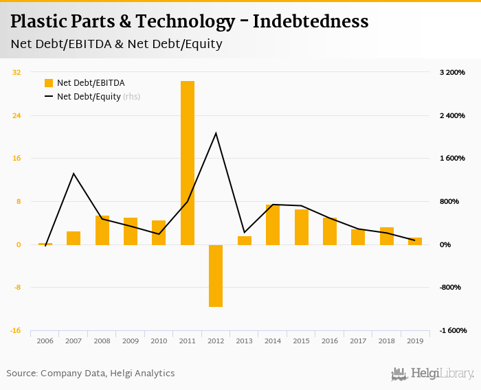 Plastic Parts & Technology's net debt stood at CZK 51.9 mil and accounted for 69.5% of equity at the end of 2019. The ratio is down 139 pp compared to the previous year.