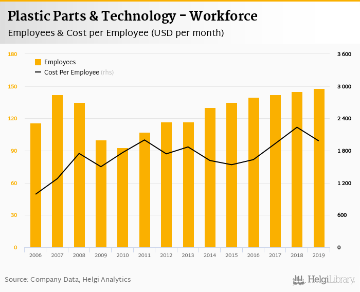 Plastic Parts & Technology employed 148 employees in 2019, up 2.07% compared to the previous year. Historically, between 2005 and 2019, the firm's workforce hit a high of 148 employees in 2019 and a low of 93.0 employees in 2010.