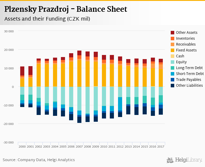 Plzensky Prazdroj's total assets reached CZK 15,052 mil at the end of 2017, down 4.53% compared to the previous year.