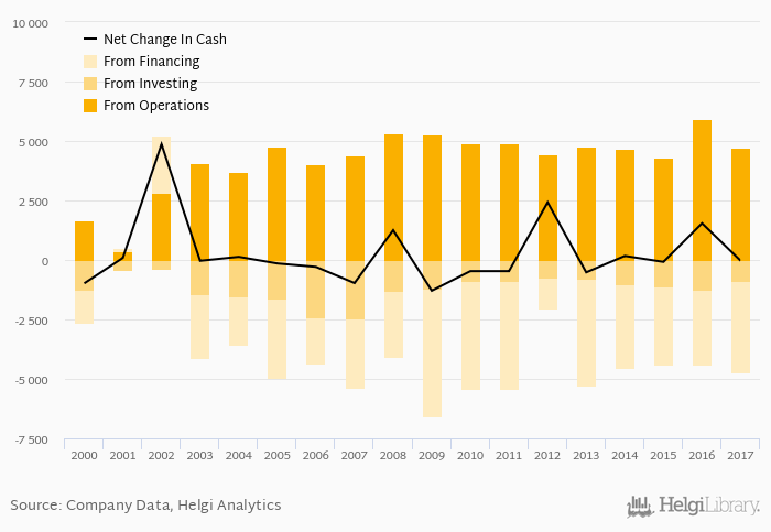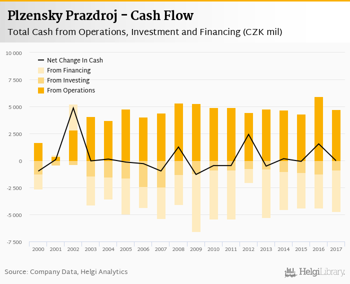 Plzensky Prazdroj's operating cash flow stood at CZK 4,706 mil in 2017, down 20.6% when compared to the previous year. Historically, between 2000 - 2017, the firm’s operating cash flow reached a high of CZK 5,930 mil in 2016 and a low of CZK 383 mil in 2001.