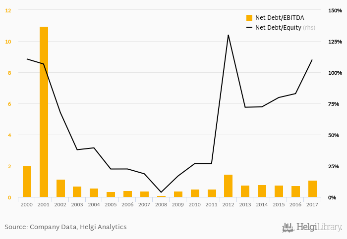 Historically, the firm’s net debt to equity reached a high of 130% in 2012 and a low of 3.78% in 2008 between 2000 and 2017. The average for the last five years was 83.4%.