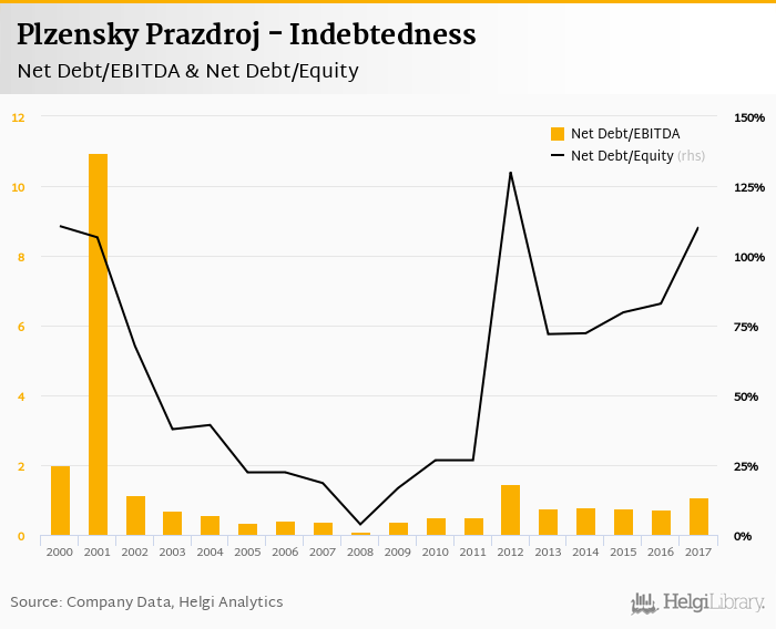 Plzensky Prazdroj's net debt stood at CZK 5,091 mil and accounted for 110% of equity at the end of 2017. The ratio is up 27.5 pp compared to the previous year.