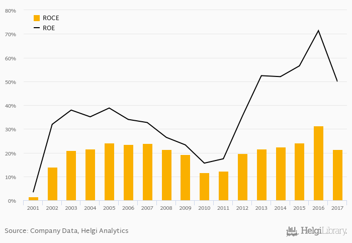The result implies a return on equity of 49.9% and a return on invested capital of 21.3% in 2017. That is compared to an average of 56.4% and 24.2% over the last five years.