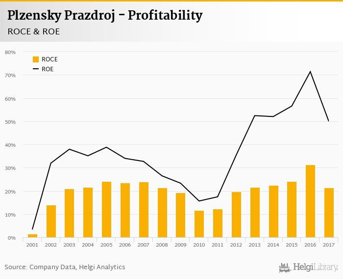 Plzensky Prazdroj made a net profit of CZK 2,619 mil in 2017, down 32.3% compared to the previous year. Historically, between 2000 and 2017, the company's net profit reached a high of CZK 3,882 mil in 2007 and a low of CZK 142 mil in 2001.