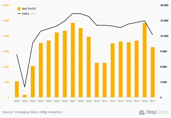 Historically, between 2000 and 2017, the company’s net profit reached a high of CZK 3,882 mil in 2007 and a low of CZK 142 mil in 2001. Over the last decade the firm's net profit decreased by an average of 3.86% a year.