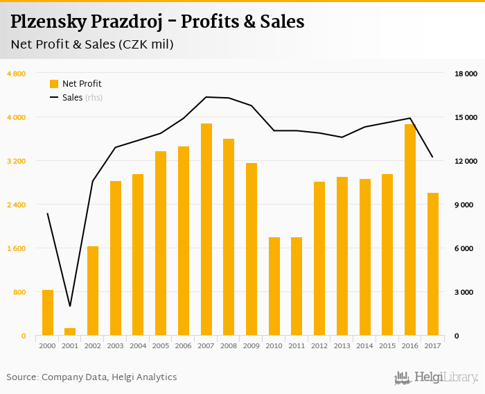 Plzensky Prazdroj made a net profit of CZK 2,619 mil in 2017, down 32.3% compared to the previous year. Total sales reached CZK 12,193 mil, which is down 18.1% when compared to the previous year.