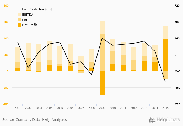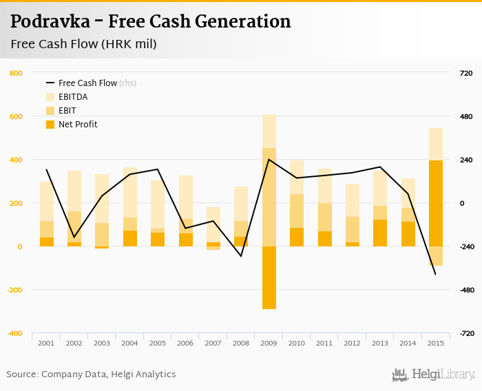 The company generated cash, defined by a sum of net profit and depreciation, of HRK 546 mil or 13.7% of sales. When investments are excluded, free cash flow reached HRK -402 mil, or -10.1% of sales in 2015.