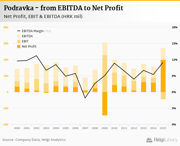 Podravka made a net profit of HRK 398 mil with revenues of HRK 3,986 mil in 2015, up by 244% and up by 16.8%, respectively, compared to the previous year. This translates into a net margin of 9.99%.